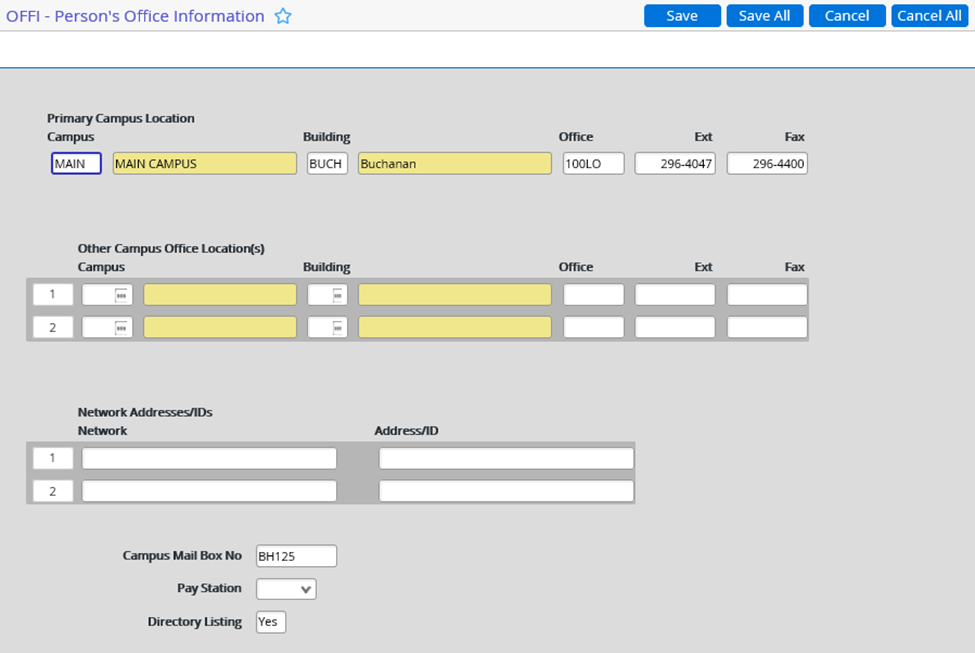 3. Enter the Office, Extension and Fax numbers as well as Campus Mail Box No into the appropriate fields.