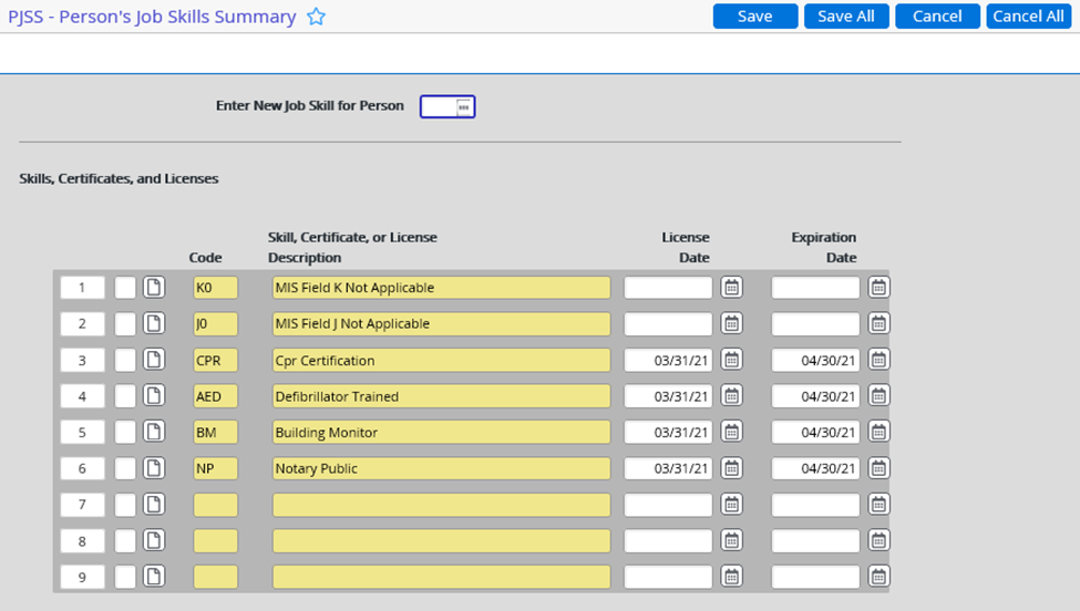 A:  A person's skills certificates, licenses, and their expiration dates can be stored on the PJSS screen.