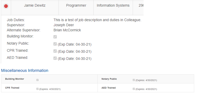 Q:  How do I tell Colleague that a person has a CPR certification, is trained on defibrillators, is a building monitor, or is a notary public?  Where do I store their respective expiration dates?